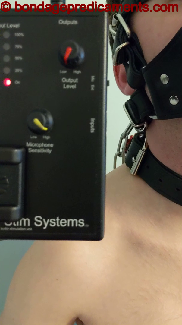 Phase 4: I turned on the Abox, a sound activated electro/e-stim box that I had previously wired to a silicone cock ring around his cock and balls. The box was strategically placed very close to his mouth, so every little sound he makes would translate into his cock and balls being shocked. Not only that, but even the fucking machine and vibrating wand caused the box to react a bit...and of course, that caused my sub to react. Then when he moans, his cock and balls only feel more electro stimulation as a result. It's a lose-lose predicament for him! (Or, is it a win-win? I suppose it depends on how you look at it, haha.)