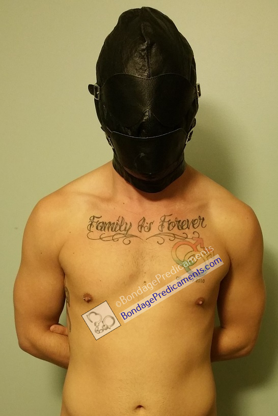 Bother Jason left the room, and returned with a leather hood. The hood had a built-in blindfold that could slide over the pledge's eyes and buckle tightly and securely. It also had a place for a removable ball gag, should it be needed later if the pledge can't keep his mouth shut when he's told to. It also had a leather piece to cover the pledge's mouth, which also bucked on tightly and securely. He put the hood on pledge Mike and strapped the blindfold and mouth cover in place.