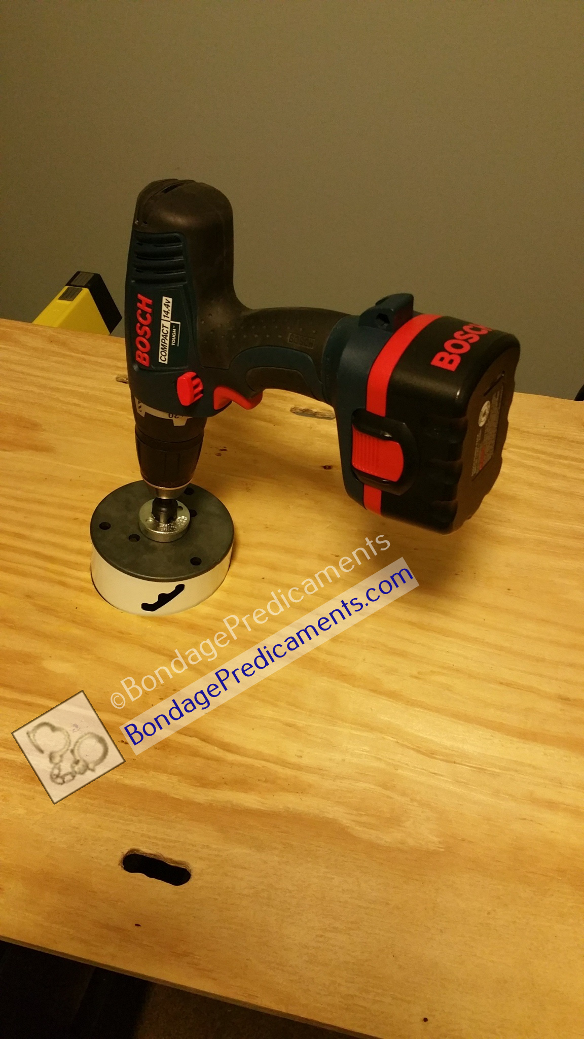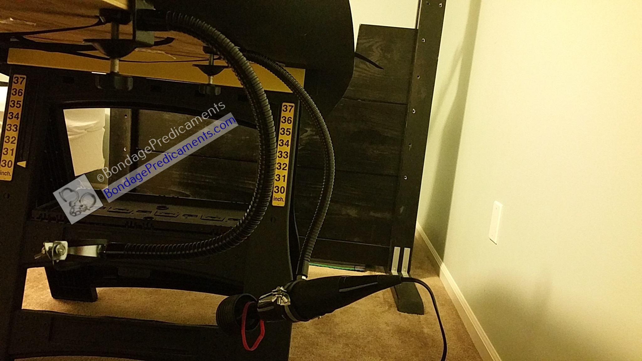 So maybe you’ve got a garage full of tools (and some sawhorses), a workout room with some gym equipment, and an attic with plywood laying across the rafters but no real space to store large items. How about combining things commonly found in those areas to build a really cool bondage table?