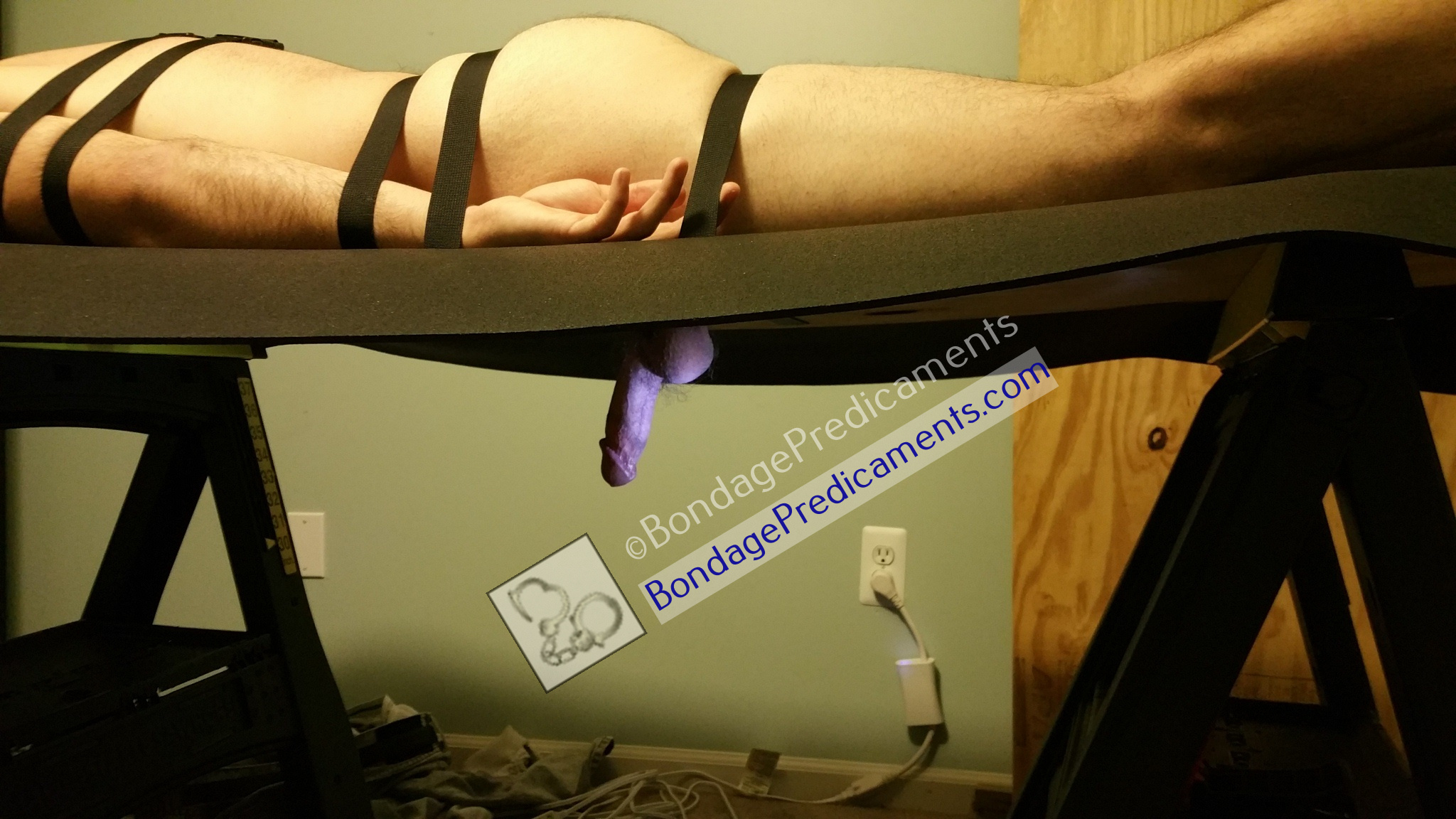 12. Have your sub lay on your new bondage table, facing down, arms at his sides, with his dick/balls pushed through the center hole. You can use a few additional utility straps to run around his chest and arms to keep them held together. Then use the remaining straps to strap him down to the bondage table. You won’t want him moving much for the relentless edging and cock teasing to come! ;)