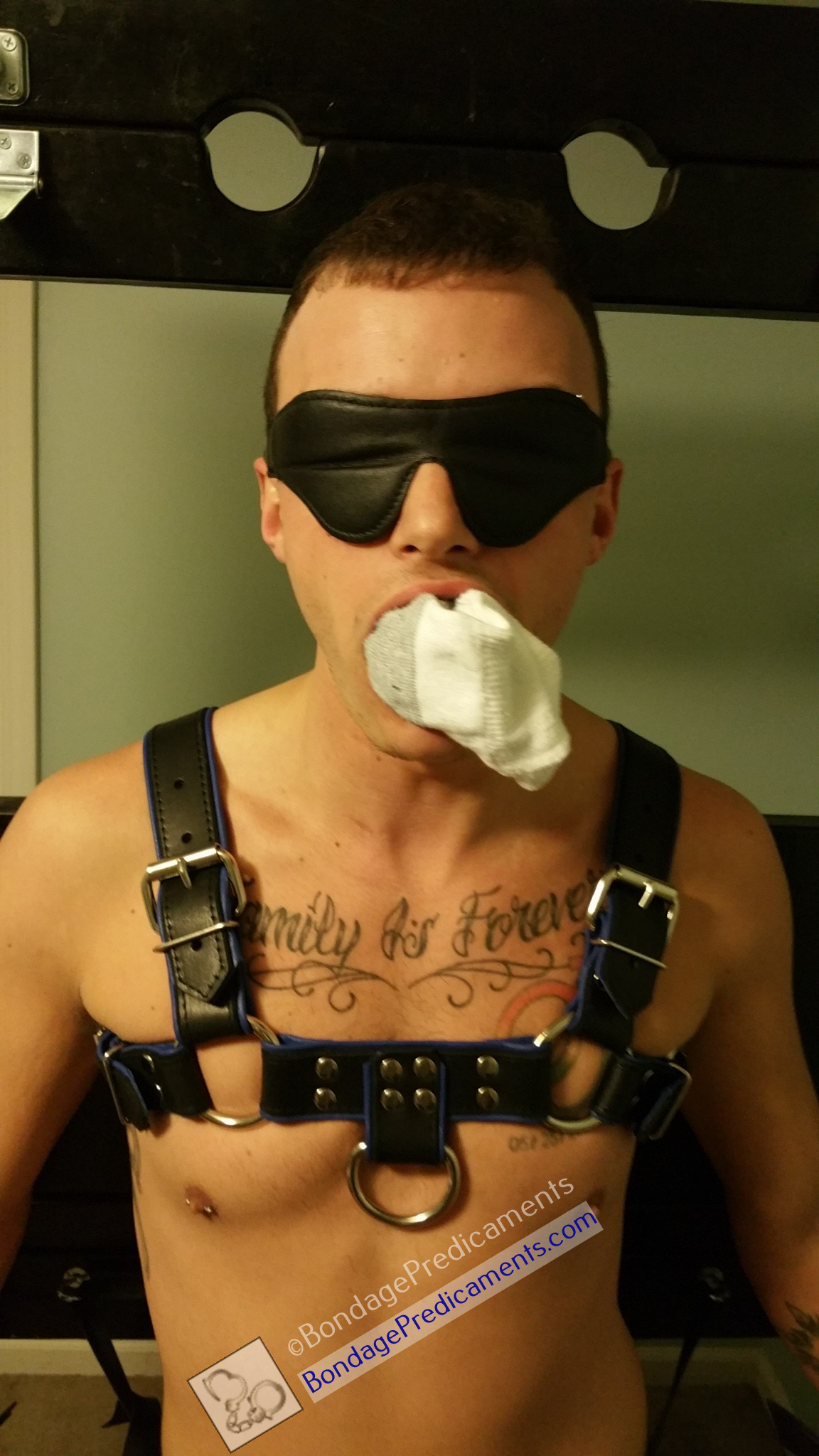 Gboy’s opinion of this gag: “This gag was more on the humiliating side. Pretty much as humiliating as it can get. Luckily my Sir had pretty clean socks. ;) Could be made a lot worse depending on how smelly the sock is.” (Although his cock did jump when I gagged him with my socks as you can see in the pics below, just saying…that just might have been a sign.) ;)