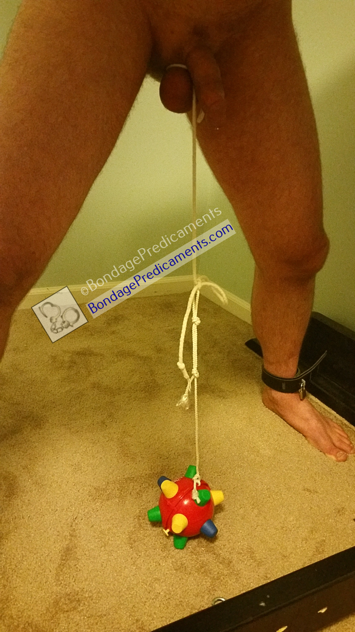 Kick back and watch the show as the ball vibrates and bounces around on the floor. When it reaches the end of the rope slack, it will tug on your sub's balls. Then it might bounce back, or it might keep trying to get away, tugging on his balls more. Part of the fun here is it's pretty random.