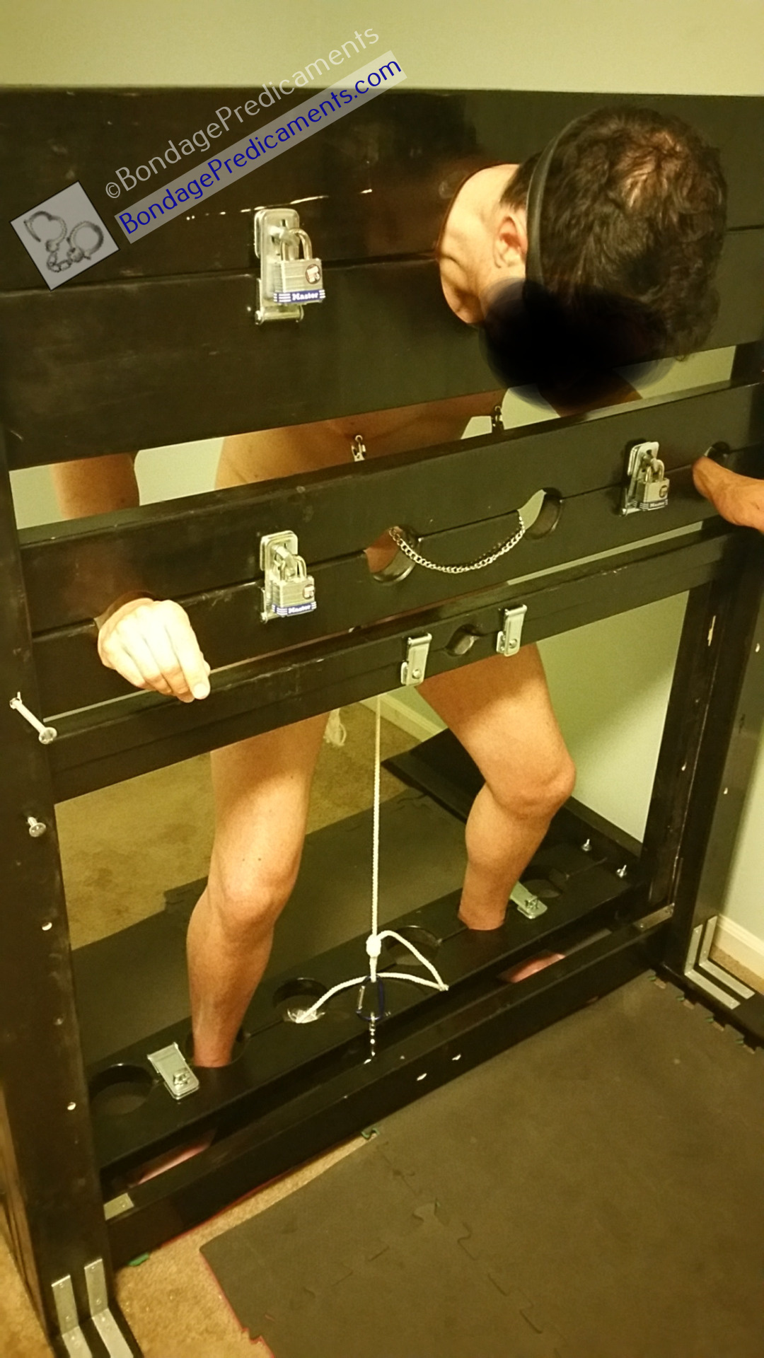 So I started him out locked in the stocks. But just being locked in the stocks wouldn’t even be a 5 for any guy in decent shape. So after he was locked in, I unlocked the cock stocks and lowered the boards that locked his head and hands in to a level that forced him to bend over, to make him more “comfortable”. <grin> He still looked a bit too comfortable, so I decided to tie his balls leaving a loop at the end of the rope. This allowed me to use clips and carabiners to gradually shorten that rope by clipping it to an eyebolt at the bottom of the bondage wall…and that’s just what I did. As I shortened the rope, he had to squat down more and more, testing his endurance.