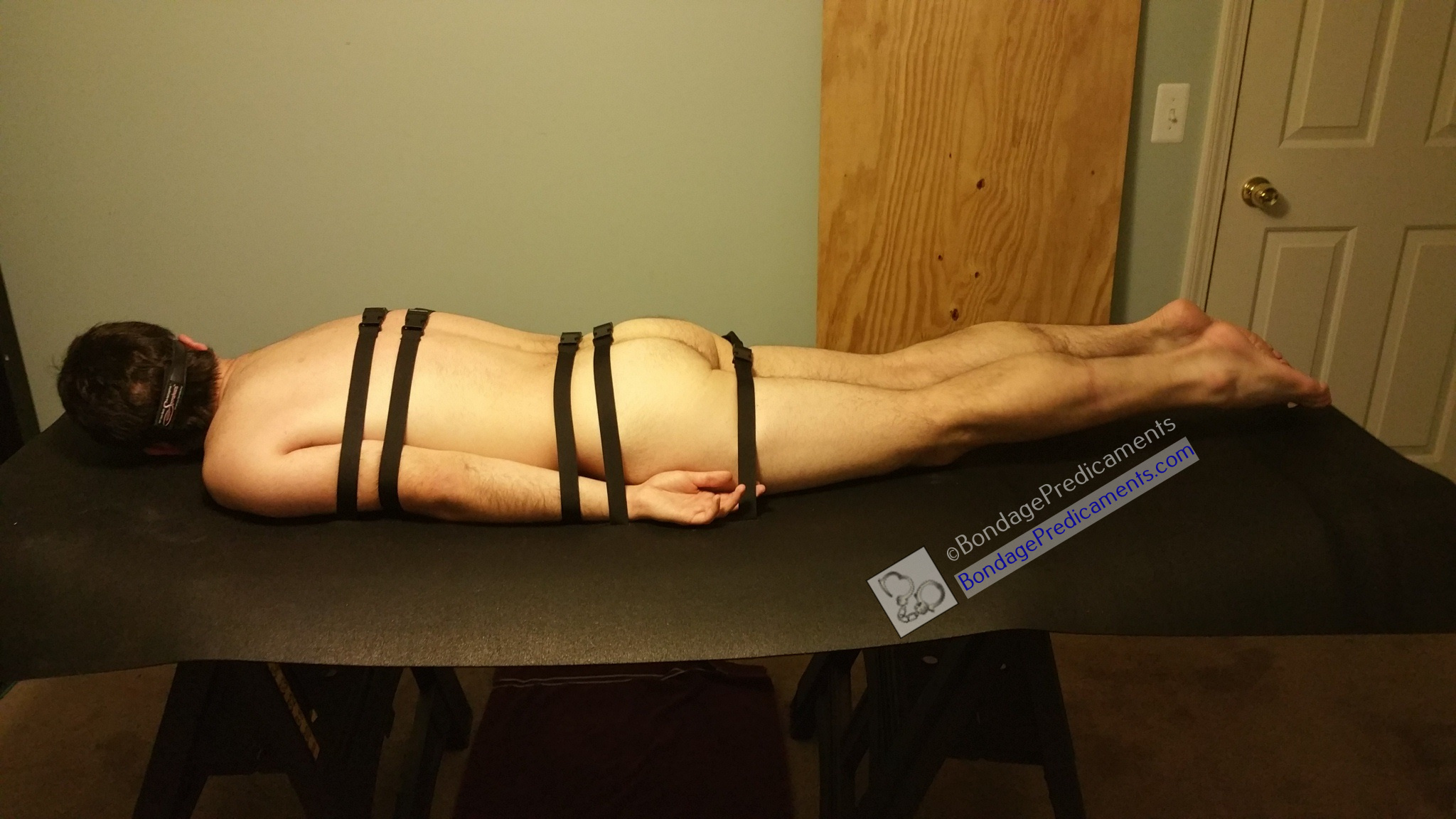12. Have your sub lay on your new bondage table, facing down, arms at his sides, with his dick/balls pushed through the center hole. You can use a few additional utility straps to run around his chest and arms to keep them held together. Then use the remaining straps to strap him down to the bondage table. You won’t want him moving much for the relentless edging and cock teasing to come! ;)