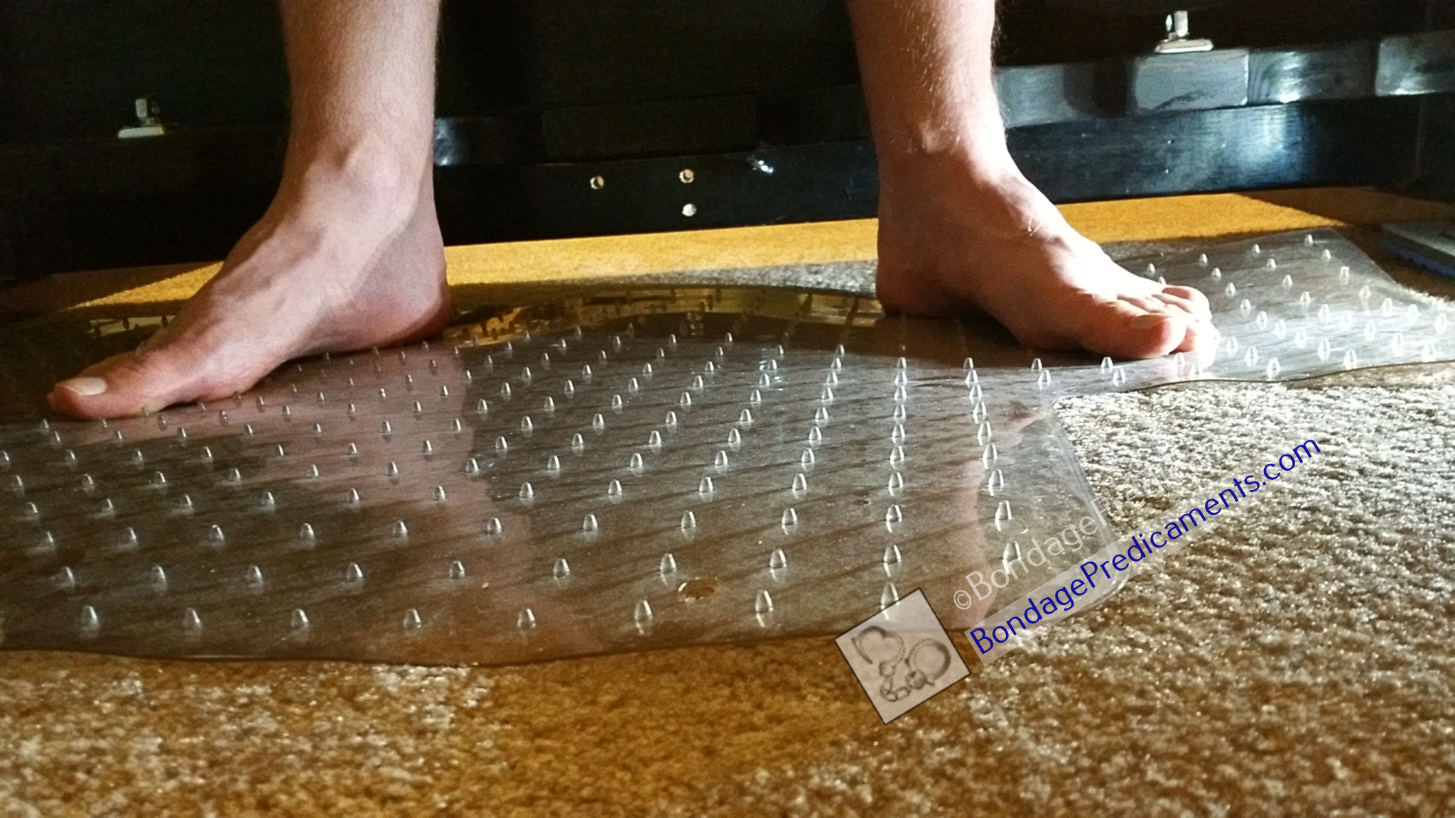 Restrain your sub in a position that makes it difficult to remain still (standing bondage with one foot on the floor and one leg bent with that foot tied to his balls, or stand him up/lay him down on an upside down office mat so he'll want to adjust as the rubber spikes dig in more over time, etc.). Use bondage tape or something similar to secure the motion activated e-stim power box to him (usually a leg works well, just make sure it's secured to a part of him that he is likely to want to move). Attach your e-stim accessories (cock loops around dick, maybe an e-stim plug in his ass, whatever you want). Turn the power box on and watch the show as he tries to remain still, knowing that he will pay the price for any sudden movements.
